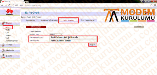 Açılan sayfanın sol kısmındaki menüden Aygıt bölümüne tıklayarak üst kısımdan WAN Ayarları kısmına giriş yapıyoruz. Açılan bu sayfada İnternet Kullanıcı Adı ve İnternet Şifresi yazan kısımlara Adsl Kullanıcı Adı ve Adsl Kullanıcı Şifremizi yazarak Uygula butonu ile ayarları kaydediyoruz.