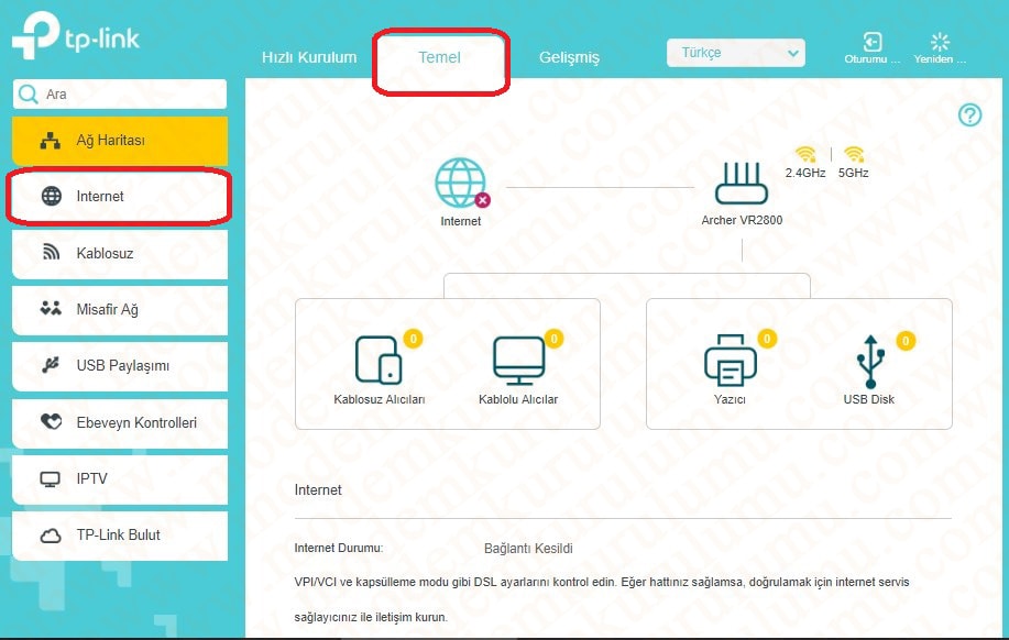 Açılan ekranda TP-Link Archer VR2800 Kablosuz Modem bilgilerini gösteren arayüz ekranını göreceğiz bu ekranda ADSL ayarları için sayfanın üst kısmında yer alan menüden Temel kısmına tıklayarak sol taraftaki menüden İnternet seçeneğini seçiyoruz.