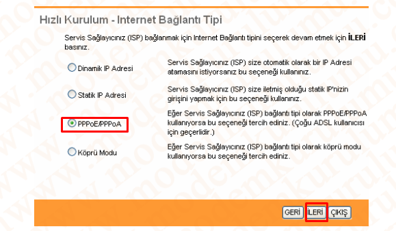 Devamında bağlantı tipini seçeceğimiz ekran çıkacaktır bu kısımda PPPoE/PPPoA olanı işaretleyerek İLERİ butonu ile devam ediyoruz.